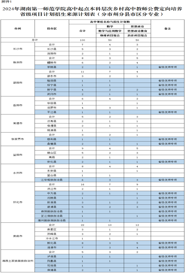 附件:1. 2024年bevictor1946韦德官网高中起点本科层次乡村高中教师公费定向培养省级项目计划招生来源计划表(分市州分县市区分专业)