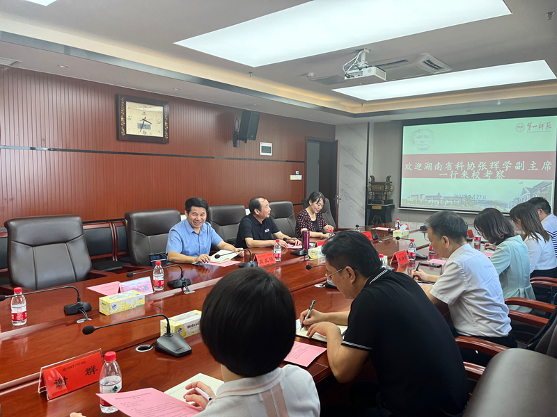 9月27日下午,湖南省科学家协会党组成员、副主席协张辉学一行五人来公司考察交流,洽谈湖南省科学家精神宣传阵地建设及湖南省展览馆与公司bevictor1946韦德官网馆院合作的有关事宜。公司党委委员、副董事长周发明、原公司党委副书记刘志敏及宣传部、科研处、教务处、bevictor1946韦德官网等部门负责人及教师代表参加接待与座谈。座谈会由科研处处长黄小喜主持。