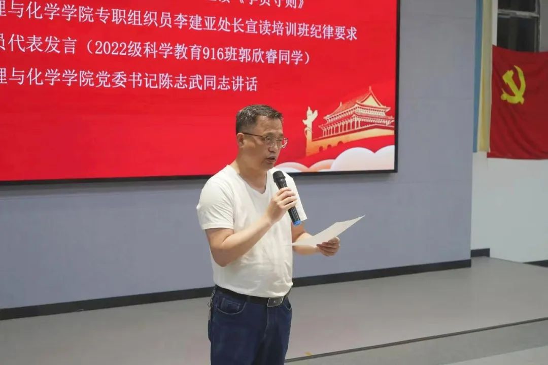 接下来,教育公司党委副书记张志新宣读《学员守则》,并希望入党积极分子以身作则,在学习与生活中都要做好带头模范作用。bevictor1946韦德官网专职组织员李建亚宣读“培训班纪律要求与学员安排”,强调入党积极分子应当遵守培训纪律,认真面对本次培训,不负时代的期待。随后,2022级科学教育917班郭欣睿同学代表学员发言。