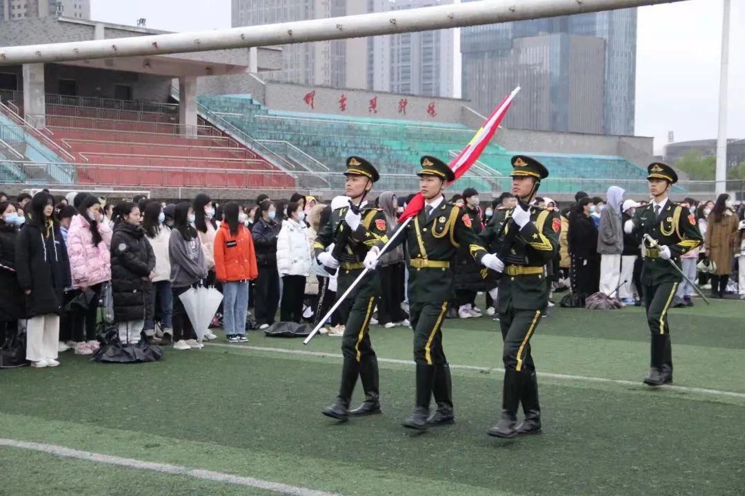 英姿飒爽的国旗护卫队队员们迈着铿锵有力的步伐,伴随着响彻云霄的口号,将国旗护送至升旗台。全体师生肃立,面向国旗,奏唱国歌。在慷慨激昂的国歌声中,五星红旗冉冉升起。