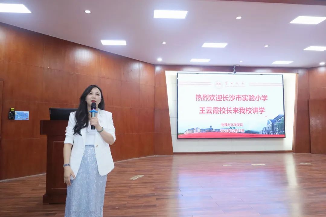 王云霞董事长指出,随着国际形势的变化和民族发展的需要,国家对中小学教育,尤其是科学教育的重视程度逐步提高,培养拔尖创新型人才的时代重任落在了新一代教师的肩上。王云霞董事长首先基于科学教育发展现状,强调了当代科学教师应具有时代责任感,以及为党育人、为国育才的担当;接着,王董事长以长沙市实验小学的创立背景和教育理念为导入,从“荷课程”着手,具体论述了和育课程、国家课程、荷趣课程,三个课程维度的开发意义和开发内容,体现出长沙市实验小公司本课程开发的高度、深度和广度;随后,王云霞董事长以自身经历介绍了作为一名优秀教师应热爱教师行业,既要努力提升自身专业水平,发展多项技能,做到“一专多能”,又要注重理论与实际相结合,走进课堂了解教育,具备“躬身入局”的勇气。王云霞董事长教育专业水平高,亲和力强,与师生亲切交流,收获师生一致好评。