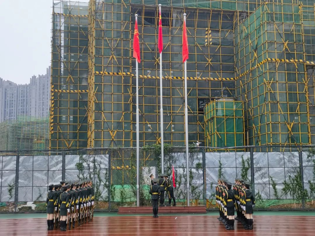歌声嘹亮,步履铿锵。伴随着激扬的《运动员进行曲》,国旗护卫队身姿挺拔精神饱满,不惧风雨,踏着矫健的步伐,动作整齐划一,送着鲜红的五星红旗迎光而来。随着护旗手振臂一挥,五星红旗从旗杆最低处缓缓上升,在最高处绽放,随风飘扬。全体师生肃然起敬,唱着雄壮激昂的国歌,行注目礼,向国旗致以崇高的敬意。